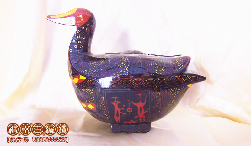 鴛鴦盒為木胎其身,體分兩半,制作再粘合成,頭頸與身體則榫卯相連,故頭能自由轉(zhuǎn)動(dòng)。背上有一長(zhǎng)方形口與蓋相扣合,蓋上浮雕龍紋。整器外髹黑漆,其上用紅色和金色描繪眼、嘴、羽毛以及菱形紋等。在它的腹部還描繪了建鼓舞和撞鐘擊磬的情節(jié)畫(huà)??脊棚@示為古代宮女漆盒、木豆或胭脂盒。