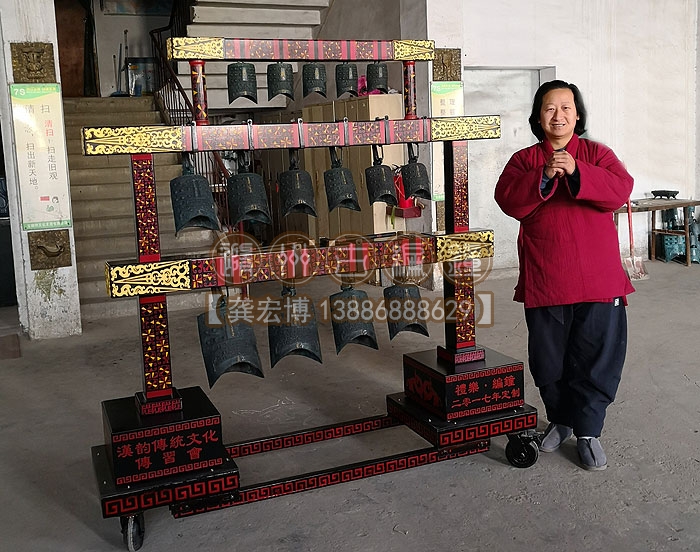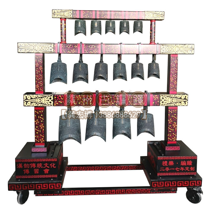 合肥漢韻文化傳習(xí)會定制的15件3層編鐘長1.9米、高1.86米、寬0.5米,音律齊全,演奏使用方便,木架上可以彩繪客戶定制文字或圖案,底部安裝鋼制滑輪,安裝移動都非常方便,配有樂器標(biāo)準(zhǔn)航空箱,外出表演得心應(yīng)手。