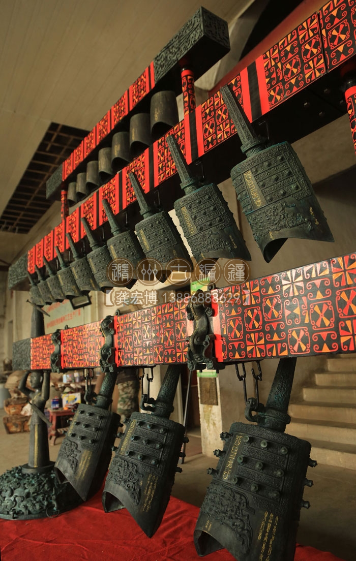 56件編鐘長5.6米、寬2.52米、高2.32米、重1600公斤,采用鋼架結(jié)構(gòu)制作,表面噴繪仿古油漆,適用于室外或半室外情況陳列。